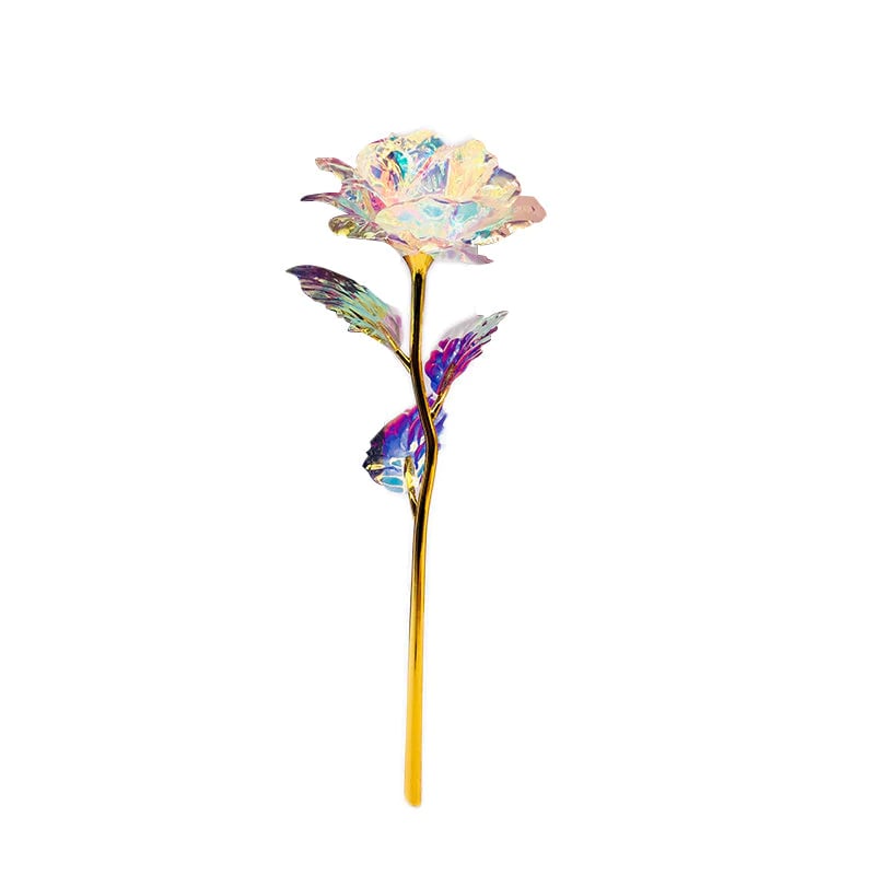 Slutligen täcker vi dem med en bländande holografisk beläggning så att rosens PVC-handtag och PVC-kronbladen gnistrar i ljuset. Sedan placerar vi varje bländande, holografiskt belagt blomblad för hand, vilket gör att rosorna ser så slående ut!