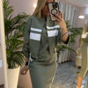 VERTIKALA SIDORÄNGA– Klänningen accentueras av vertikala ränder längs sidorna, vilket subtilt förlänger siluetten och skapar ett elegant utseende. Denna detalj tillför inte bara visuellt intresse utan framhäver också kroppens naturliga linjer. Randdesignen harmonierar med den färgblockerade jackan, vilket gör att de två plaggen bildar en sammanhängande och stilfull helhet.